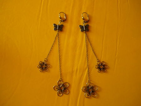 Vite vite, l’ouvrière a ressorti les fleurs du printemps, c’est la springtime attitude, chouette ! Les b.o. ont été réalisées d’après un modèle de la droguerie, en juin dernier (oui, vous avez bien lu, ça date…), et tout le matériel vient de là aussi. L’ouvrière les trouve super romantiques, elles vont vraiment bien avec les petits tops de l’été, elle les a testées maintes fois en vacances au bord de la mer. Malheureusement, il y a quelques semaines, l’ouvrière a perdu un morceau de ses b.o. à Rennes, alors qu’elle allait prendre le métro. Enfer et damnation ! L’ouvrière était triste comme tout, d’autant plus qu’elle n’a pas retrouvé son bout de chaine en faisant le trajet à l’envers, le soir, en rentrant ! Heureusement qu’elle a pu passer à la droguerie dans la même journée, et ziou, elle a pu réparer ses b.o., non mais !