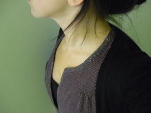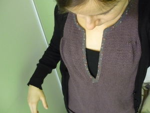 Et c’est là qu’intervient le papa de l’ouvrière, the best quand il s’agit des finitions ! L’ouvrière avait commencé à réfléchir à la meilleure façon de virer le crochet de ses bordures d’encolure, du coup elle est allée chercher du biais à la droguerie, le courson prunelle ! Ah il est fabuleux, l’ouvrière l’adore ! Et, comble du bonheur, il est merveilleusement bien assorti à la laine Muse de chez Phildar. Du lin et du coton, c’est super agréable à tricoter, et la tunique est légère, légère ! Au final, même si ç’a été long à finir, l’ouvrière est plutôt contente d’elle, c’est une jolie tunique idéale pour le printemps. Le modèle est issu du magazine printemps-été de l’année dernière, « In The Navy ».