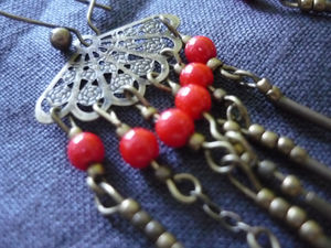 L’ouvrière a juste eu besoin de réfléchir un peu pour trouver un agencement harmonieux et pas trop déséquilibré, parce qu’elle en avait, du matos, pour cette paire-là ! Elle a trouvé son inspiration ici, mais non, bien sûr, il ne s’agit pas exactement de la même paire de b.o. (quand même, l’ouvrière ne se permettrait pas !). Elle est restée dans sa tendance du moment, le corail (comment ça, l’ouvrière tourne en boucle ?), mais c’est tellement efficace, vous n’avez pas idée… Et sa Laurette adorée les a trouvées jolies et fraiches (merci ma Laurette !), so mes b.o. ont été approuvées !