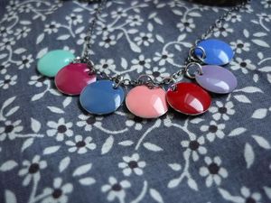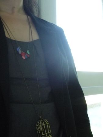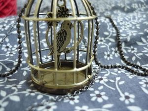 Mais l’atelier, c’est pas un endroit facile à vivre pour un perroquet, alors il fallait bien que l’ouvrière le loge quelque part… (vous savez, moi aussi j’ai fredonné la chanson de Pierre Perret quand j’étais petite !) Alors voilà, une petite cage a fait l’affaire, avec une chaîne pour le suspendre. Au début, il n’était pas mécontent, il gardait le sourire, mais l’ouvrière est revenue au tricot et là il s’est carrément mis à bouder et à piailler comme un fou. So so so, sa gentille maman l’a assorti à un collier trop mimi avec des pastilles qui ressemblent à des smarties (miam !), et il s’est calmé.