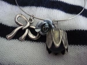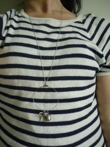 La base de ce sautoir, comme on peut facilement le voir sur les photos, est archi simple (concept qui correspond parfaitement à l’esprit de l’ouvrière, zéro prise de tête ! Bah quoi ? ), une simple créole sur laquelle sont suspendues trois petites breloques, et une chaîne longue (60 cm je crois, si mon champignon pouvait confirmer…) pour rendre l’effet sautoir. Et, croyez-le ou non, mais un concept simple fait qu’on peut le porter avec n’importe quelle tenue, du coup, l’ouvrière est assez satisfaite, elle a vaincu l’effet sautoir ! Enfin ! =)