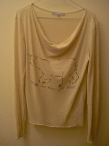 Heu, non, rien de tout cela ! En vrai, l’ouvrière, il est trop nul ton titre ! Je faisais juste allusion à un petit haut de chez Somewhere que j’ai reçu il n’y a pas très longtemps, tout simple mais tout doux, tout chaud… et recouvert d’un ours trop mignon qui marche sur la banquise ! Au demeurant, vous pouvez toujours vous moquer de moi, n’empêche qu’il est trop bien assorti aux températures ambiantes (et na ! T’as vu ça, l’effet de serre ? Au moins, chez moi, il n’a pas trop chaud !), qu’il contient de la laine et est presque blanc comme neige (Pfff…). Bref, il arrive aussi à l’ouvrière d’avoir des coups de coeur et aussi le moral en berne depuis que Piaf a migré vers des températures plus clémentes le temps de l’hiver.