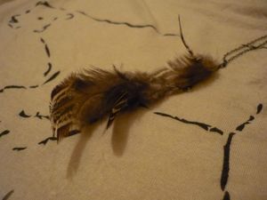 Du coup, qui dit nouveau petit haut dit nouveaux accessoires ! C’est dans ces moments-là que j’adooooooooore vous sortir des trucs bidouillés depuis belle lurette et oubliés au fond d’un tiroir (parce que, vous le savez bien, l’ouvrière fait toujours trouze millions de trucs en même temps), et qu’un jour, on redécouvre par hasard avec une innocence coupable au fond des yeux. So, pour ce petit haut, j’ai déniché un sautoir que j’avais en tête depuis un loooooong moment, et que j’ai mis un temps certain à réaliser, because les plumes, je trouve ça moyen à travailler, mais c’est tellement bon d’avoir un brin de sauvagerie chez soi ! Ce qui nous donne un sautoir light, avec juste ce qu’il faut de plumes (pour les discrètes comme moi, c’est parfait !) pour jouer à la pintade…