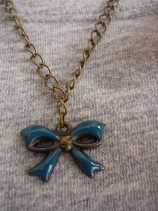Vous aurez aisément reconnu l’inspiration du sautoir, vu l’année dernière ici, j’avoue que l’idée m’avait vachement enthousiasmée quand je l’avais vu ! Et puis j’ai laissé passer les mois, le temps a changé et je suis passée à autre chose (comme d’hab). Et puis, l’été a tardé à revenir, d’ailleurs je ne suis toujours pas sûre que ce soit le cas à Paris, m’enfin, maintenant j’ai mon collier à pompons pour mettre un peu de soleil dans ma vie ! Le mini collier avec le noeud bleu accompagne le sautoir, c’est très fille quoi !