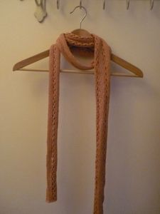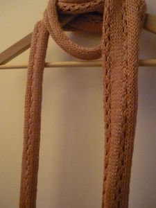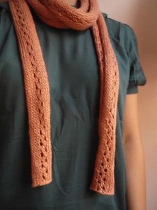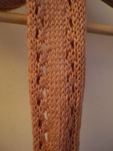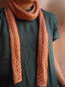 Bon, j’arrête là mes piteuses excuses et je vous présente le modèle en question. Il s’agit de l’écharpe au point de croquet de la droguerie, parue dans le livre « Léger et douillet », et, comment dire, j’avais envie de la tricoter depuis longtemps ! Le point dentelle m’attirait autant qu’il m’effrayait (dingue d’ailleurs comme le tricot peut donner des sueurs froides), et j’ai su dès le début que je lui destinais un coloris qui sentait bon la fin de l’été. Sérieux, ce lin bronzette, il est trop trop beau ! Et le rendu du point dentelle après blocage, une merveille, l’ouvrière a passé avec succès l’étape dentelle dans son C.V. tricot !