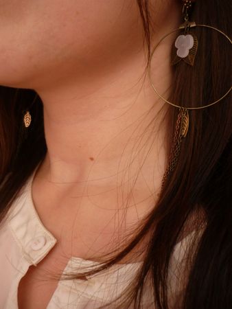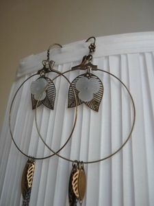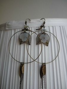 Le modèle parfait. Des créoles en laiton super légères, les petites feuilles qui apportent leur touche bucolique, les deux fleurs blanches translucides, et les petites chaines qui se mêlent aux cheveux, non vraiment, impossible de ne pas les faire ! Le coup de foudre absolu, en plus, je n’avais pas de BO so romantiques à l’Atelier, c’était l’occasion de réparer ce manque. Niveau technique, c’était super simple, deux trois coups de pinces et une touche de colle, c’est allé vite !